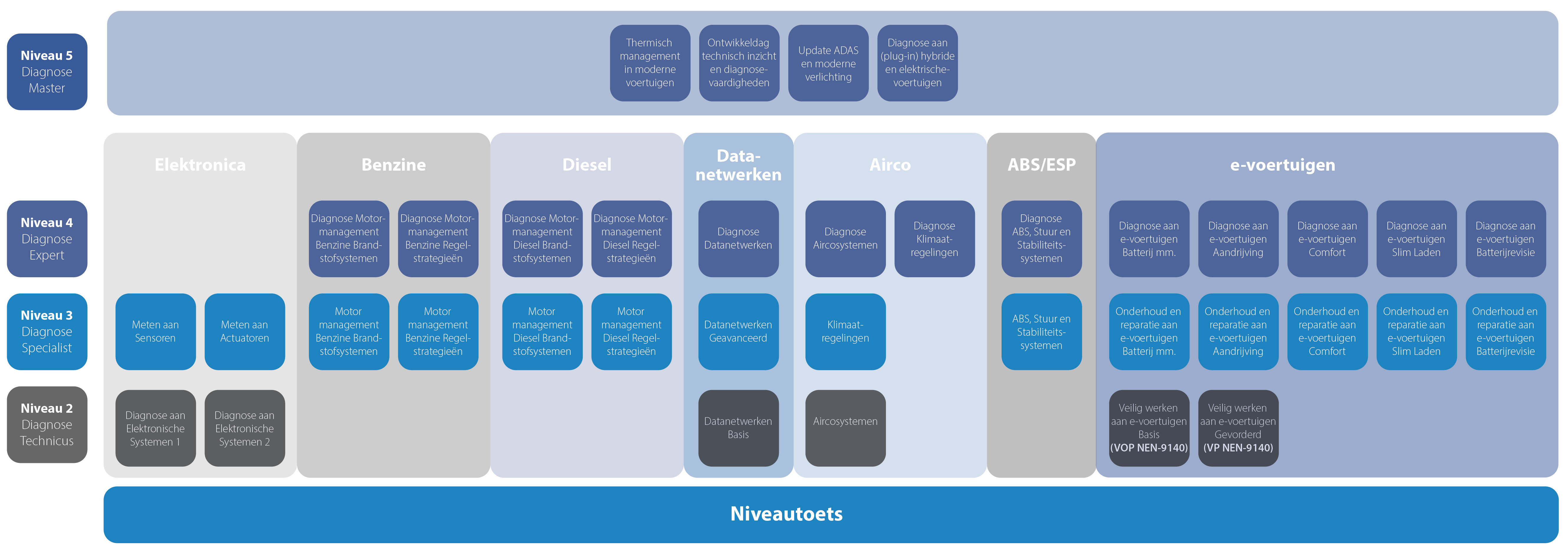 Koskamp Opleidingen biedt samen met AutoNiveau technische opleidingen aan voor automonteurs. Allereerst wordt er bepaald welk niveau u als monteur heeft, zodat u altijd uitgedaagd wordt en er geen onderwerpen worden behandeld die u zelf al onder de knie heeft. Als u start met de technische opleiding van Koskamp Opleidingen dan wordt er gestart met een niveautoets, deze niveautoets bestaat uit 8 onderwerpen. U krijgt van elk onderwerp 10 vragen, als u er 7 juist beantwoord dan heeft u dit onderwerp gehaald en komt deze niet voor in het opleidingsplan.